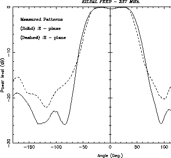 The measured phase center is at 26 mm above the reflector for both E and H- planes. Crossed dipoles are employed for dual polarization. The 327 MHz feed actually deviates slightly from the original Kildal's design - there are sleeves over the dipoles. These sleeves increase the bandwidth of the feed [5]. The VSWR plot for the 327 MHz feed is given in Figure 19.10.