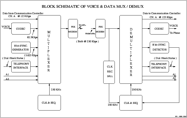 For the return link, the ANTCOM takes the monitoring information from SCC, MCMs and FPS forms a packet of SDLC/HDLC data and multiplexes with voice, hook status and aux channels into a single bit stream. This bit stream is converted into an FSK analog signal at 4.5 MHz, which is then up converted to 205.5 MHz using the regenerated 201 MHz as the LO (see Figure 24.8). This analog signal is sent along with the astronomical signals to the CEB. At the CEB thirty CEBCOMs (one for each antenna) demodulate the FSK signal to convert it back into a digital 250 kbps data stream which is passed on to COMH via a 32 way multiplexer (MUX 32) card. The voice signals from the antennas are routed to the EPABX (telephone exchange) system. The block diagram for this telephonic communication is shown in Figure 24.6. The voice signals are digitized using an INTEL 29C17 CODEC IC using a 7.8 kHz clock to produce a 62.5 kbps data stream. The CODEC uses ``A law" for data companding/expanding.
